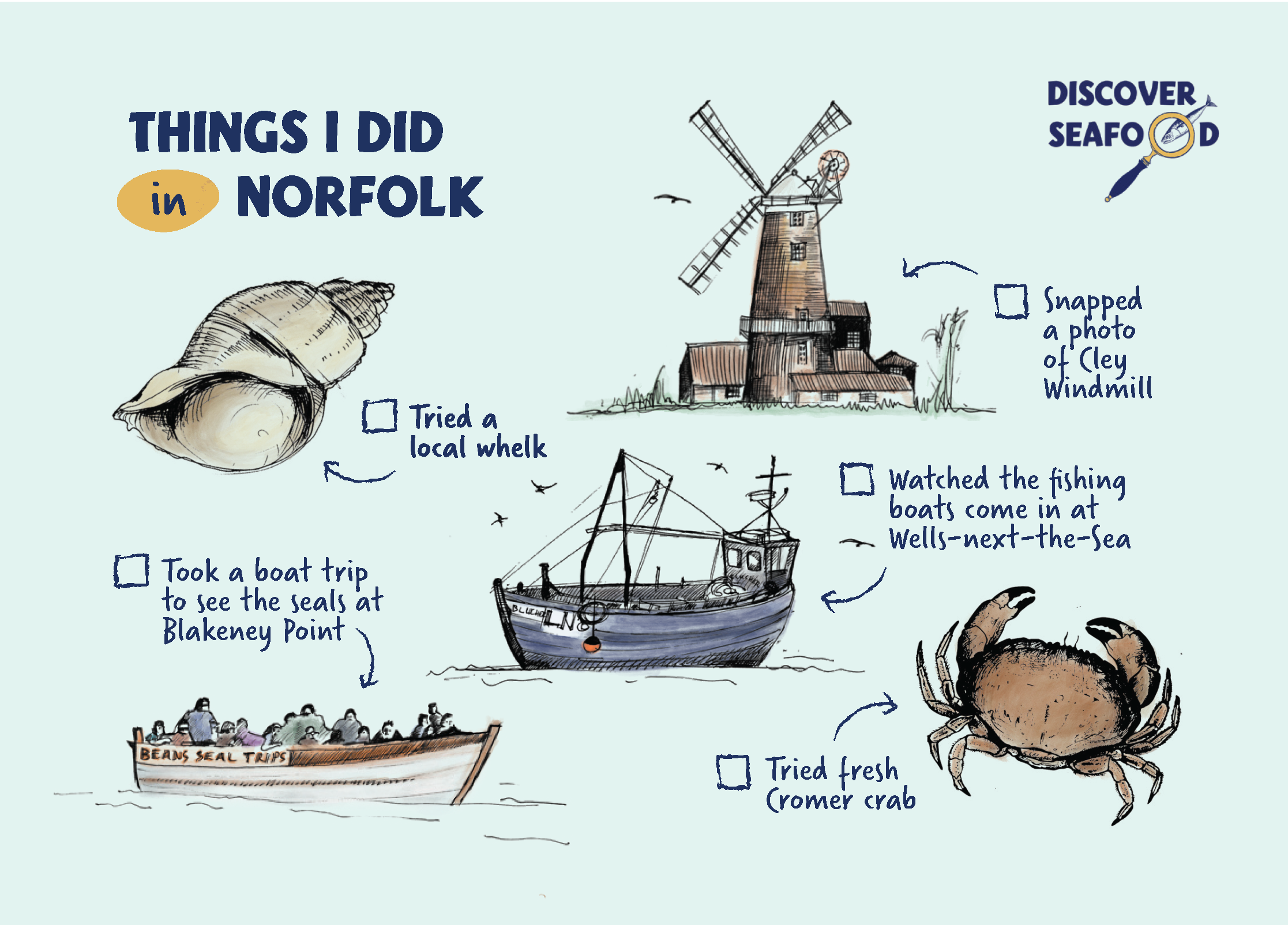 Worked with Matt Falvey, illustrator and owner of Gurneys Fish Shop, renowned for his artistic blackboards, to develop custom illustrations for the Discover Seafood Norfolk postcard.